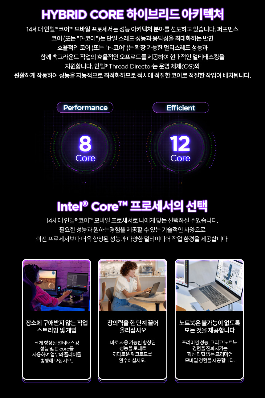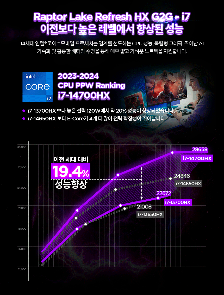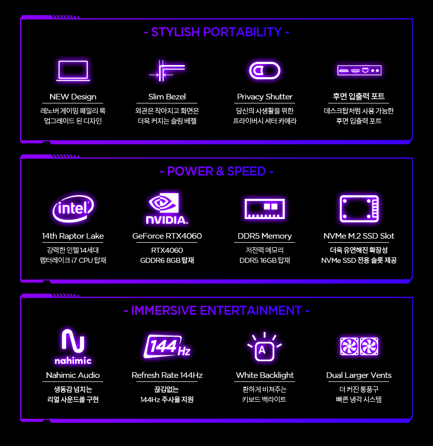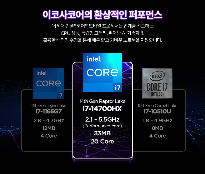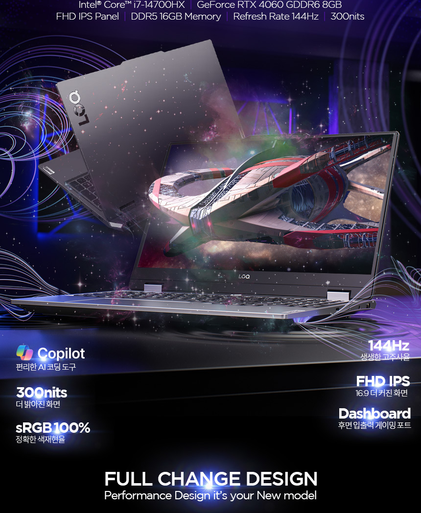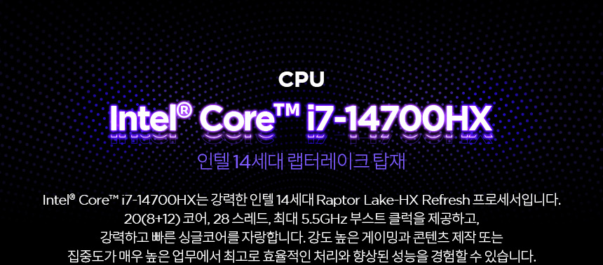 노트북 / 운영체제(OS): 윈도우11홈 / 화면정보 39.6cm(15.6인치) / 1920x1080(FHD) / 300nit / 주사율: 144Hz / CPU 인텔 / 코어i7-14세대 / i7-14700HX (5.5GHz) / 20코어(8P+12E) / 램 DDR5 / 램 용량: 16GB / 5600MHz / 램 교체: 가능 / 그래픽 외장그래픽 / RTX4060 / TGP: 115W / VRAM:8GB / 저장장치 M.2(NVMe) / 512GB / 233 Ai TOPS